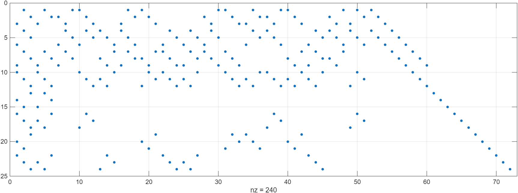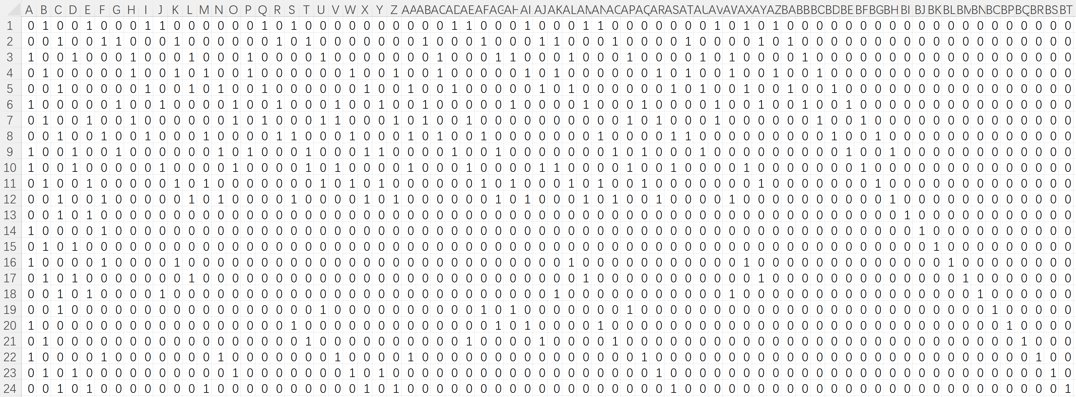 ①说明:完整校验矩阵为(72-48)=24行、72列的矩阵,代表信息比特48比特、码字比特72比特、校验比特24比特。其元素仅由0,1两种数值构成,其中第i行、第j列的元素“1”代表第j个码字比特参与第i个校验矩阵的校验。