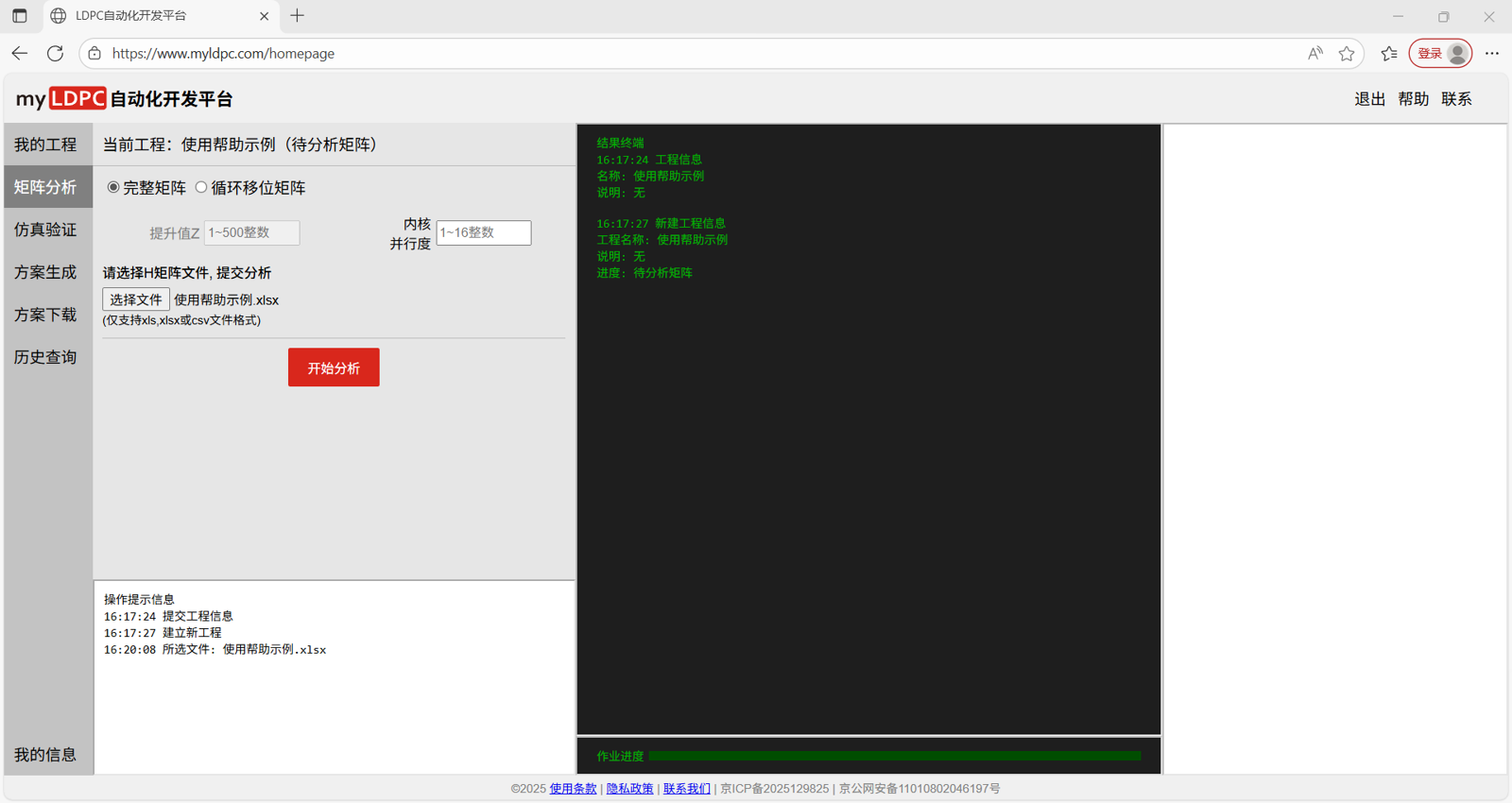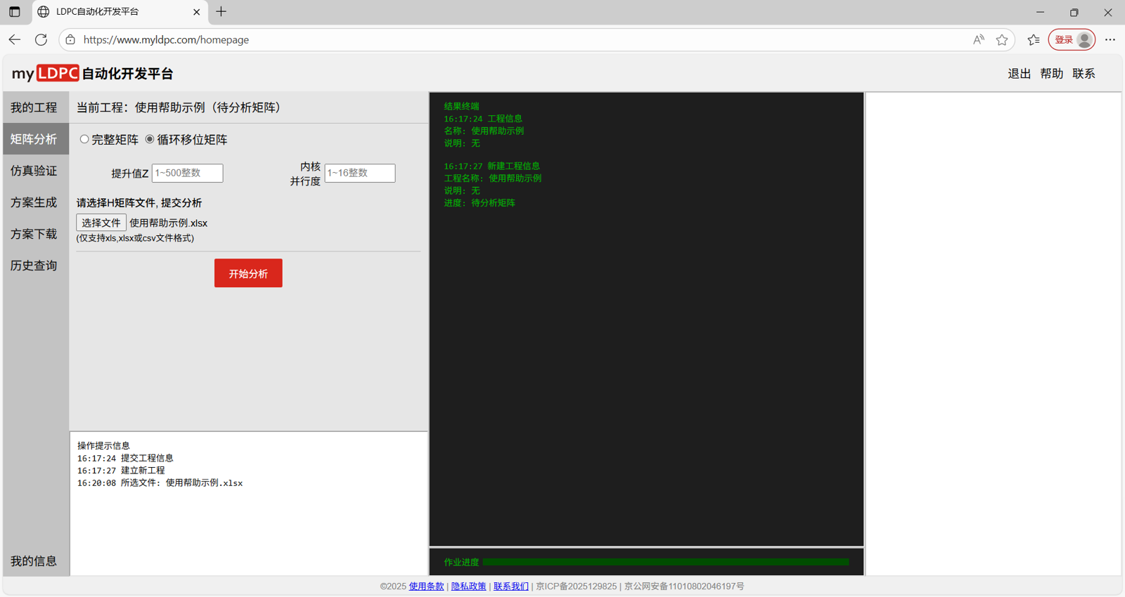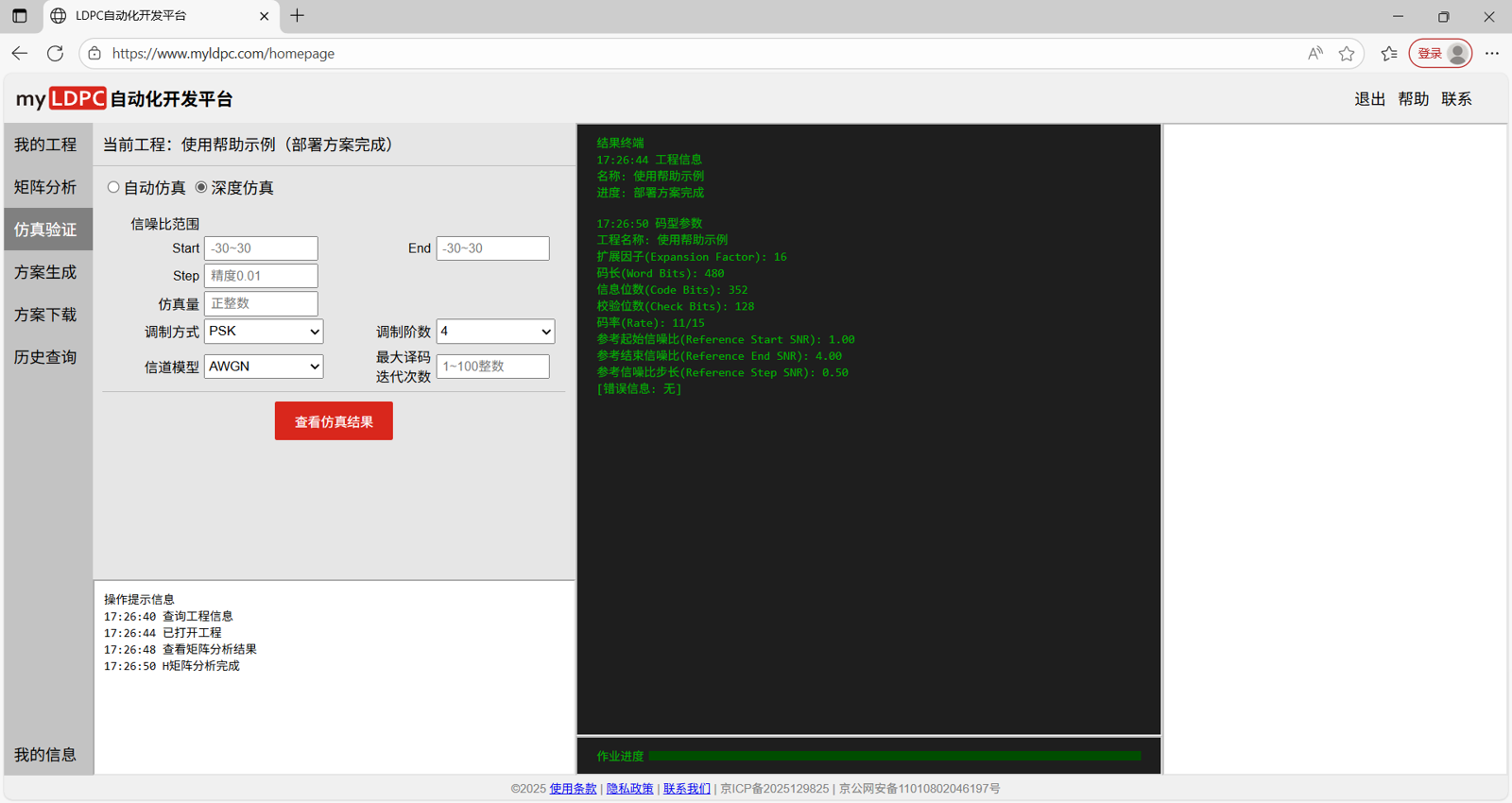 载入工作页后,新的工程需按照工程管理→分析矩阵→仿真验证→方案生成→方案下载的流程使用myLDPC自动化开发平台。具体步骤如下: