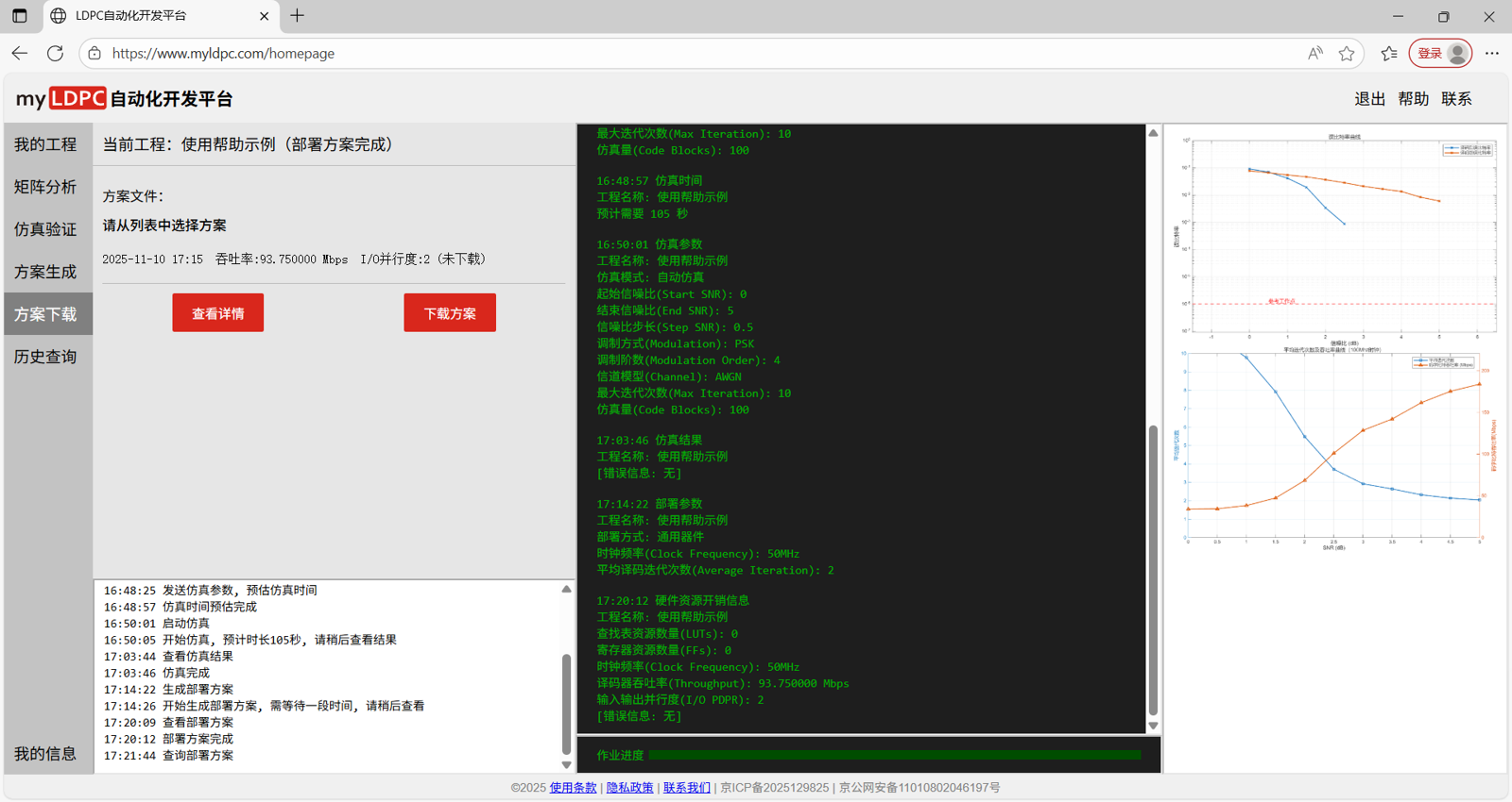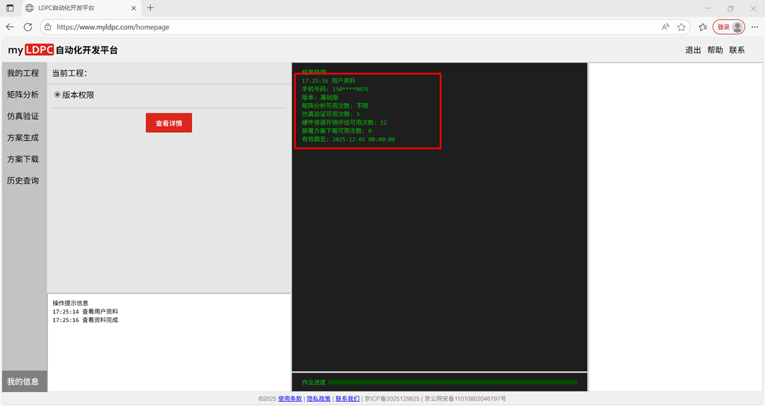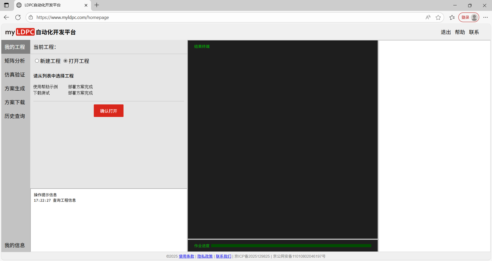 载入工作页后,新的工程需按照工程管理→分析矩阵→仿真验证→方案生成→方案下载的流程使用myLDPC自动化开发平台。具体步骤如下: