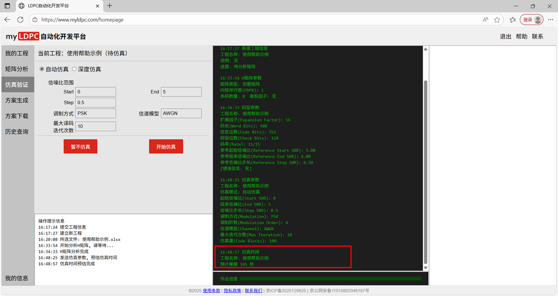参数输入栏: 选择各个阶段功能,显示相应参数配置界面。您可根据参数配置界面的信息进行具体操作。例如:分析矩阵阶段,就需要您进行矩阵选择、上传H矩阵文件等操作;仿真验证阶段,则可进行自动仿真与深度仿真的操作。