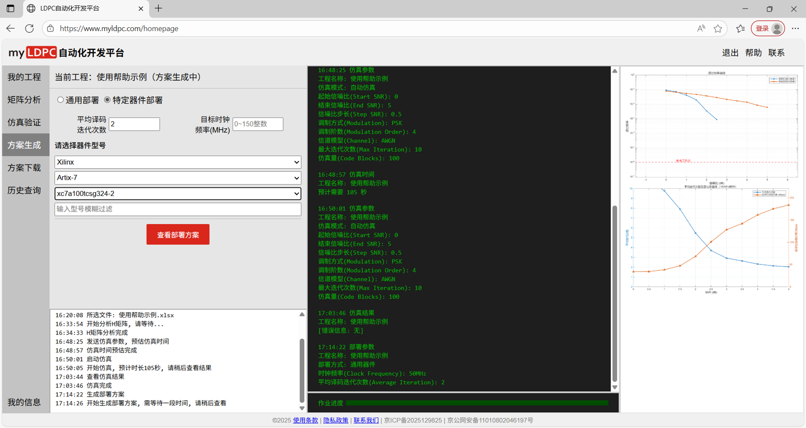 (2) 选择器件型号→输入方案参数(时钟频率、平均译码迭代次数)→点击生成方案;