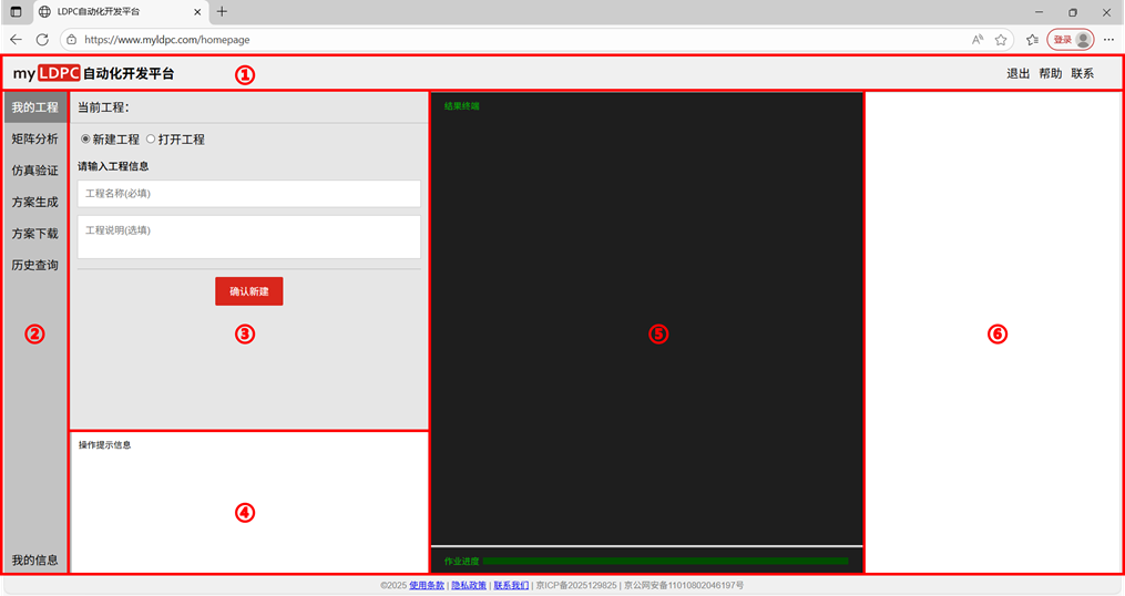 平台工具整体分为6个部分,分别为①平台信息栏、②功能菜单、③参数输入栏、④操作提示信息栏、⑤结果显示终端、⑥图像显示终端。具体地: