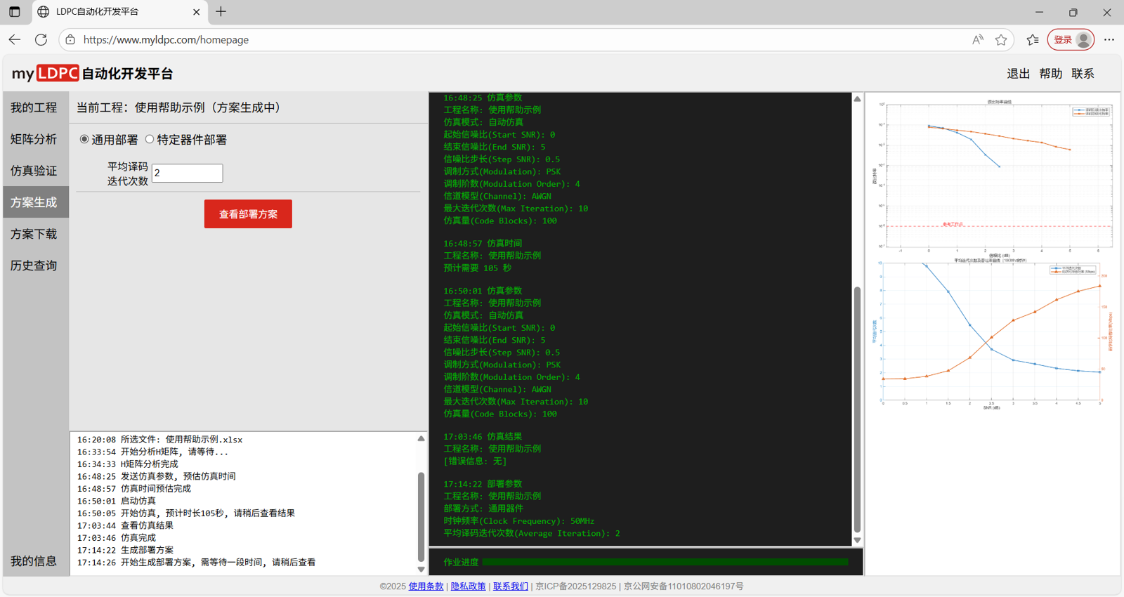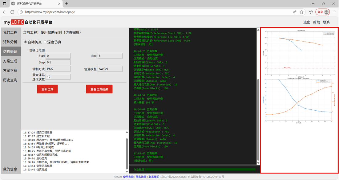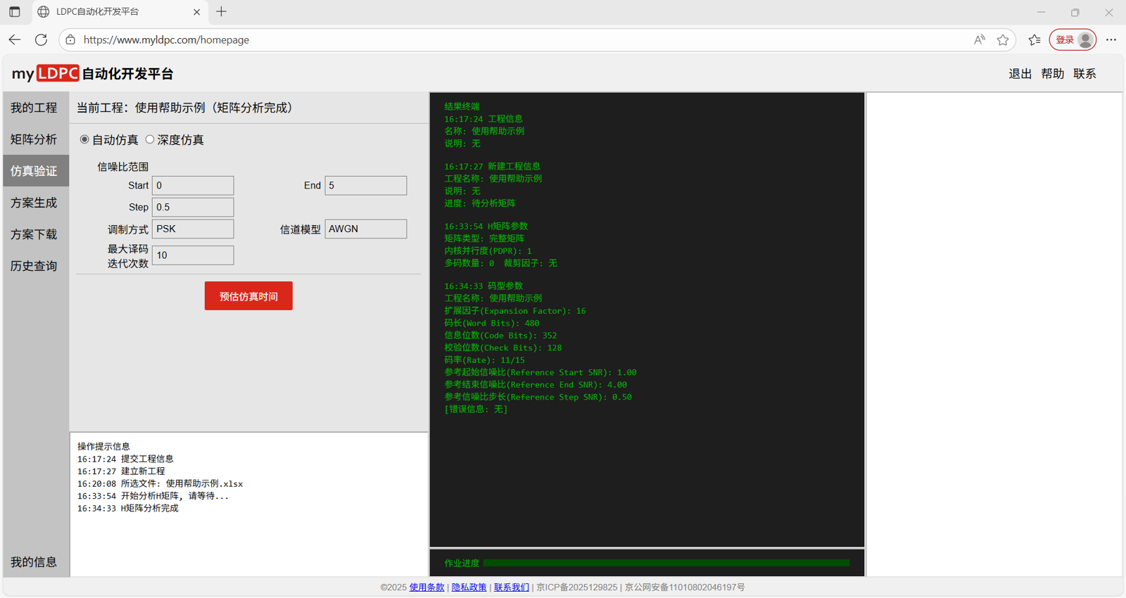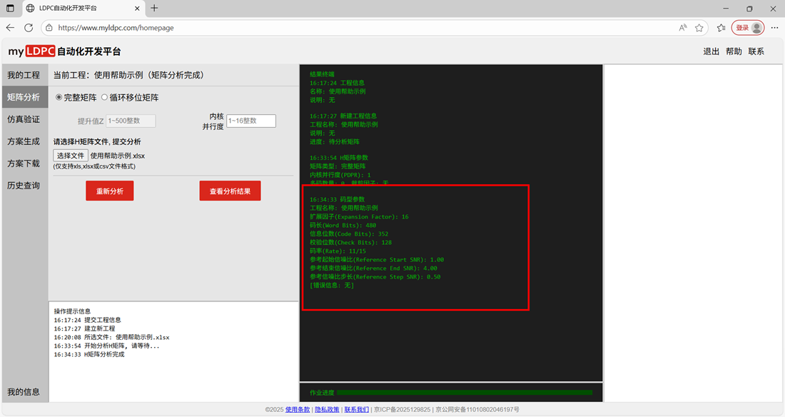 载入工作页后,新的工程需按照工程管理→分析矩阵→仿真验证→方案生成→方案下载的流程使用myLDPC自动化开发平台。具体步骤如下: