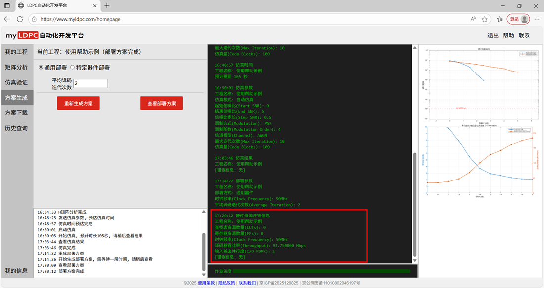 (2) 选择器件型号→输入方案参数(时钟频率、平均译码迭代次数)→点击生成方案;